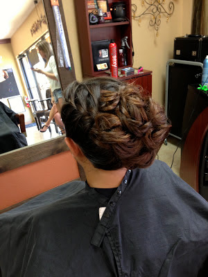 This year my very own Jenna Doll went to her very last prom! I remember when I started working at Hair to be Different, she just seemed like a little girl! For those who don't know, Jenna is the daughter of the owner Pam who has been featured many times on my blog because she always lets me be creative on her hair, hence the name Jenna doll. I did her hair for her 8th grade dance, and pretty much any special occasion after that. I put her lob (long bob) hairstyle into an inticate looking updo for this occasion. a lot of people think you have to have long hair to put your hair up, but in reality I find this length of hair is the easiest to handle. I also applied airbrish makeup to her, artificial lashes, and a beautiful sun set like shadow pattern on her lids to make her hair stand out and accent her gorgeous dress!